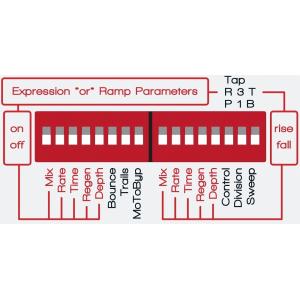 DIPスイッチによってエクスプレッションペダル、またはTONE(RAMP)ノブに好きなパラメータを割り当て、その操作幅を設定可能。エクスプレッションペダルを使用しない場合には、割り当てたパラメータを揺らして別の音を作ることもできます。また、バイパススイッチはトゥルーバイパスとバッファードバイパスを設定可能。バッファードバイパス時にはシームレスディレイをつくるTrailsがONになります。